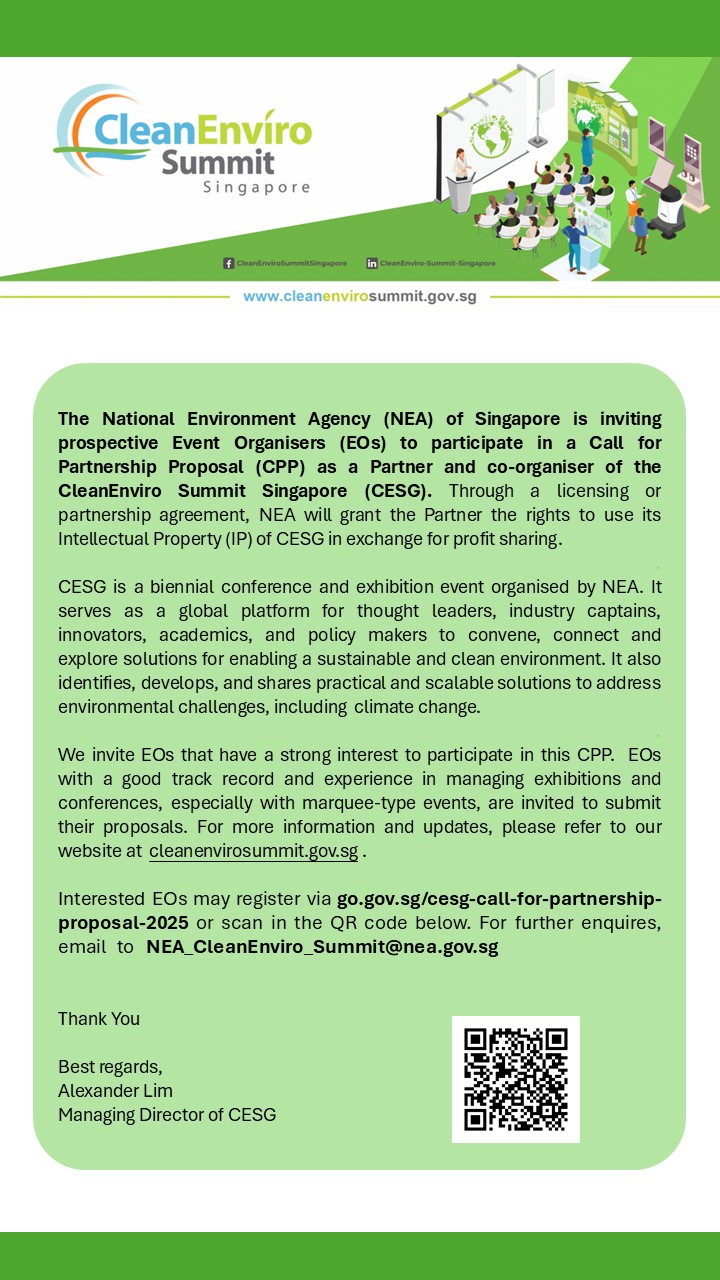 The 6th biennial CleanEnviro Summit Singapore (CESG) organised by Singapore's National Environment Agency in conjunction with Singapore International Water Week 2024 was held from 19 to 21 June 2024, and was themed ‘Action for a Sustainable and Clean Environment’. It was a global platform where thought leaders, industry captains and policymakers convened to explore solutions for a sustainable and clean environment. The key focus areas of the 2024 edition were: